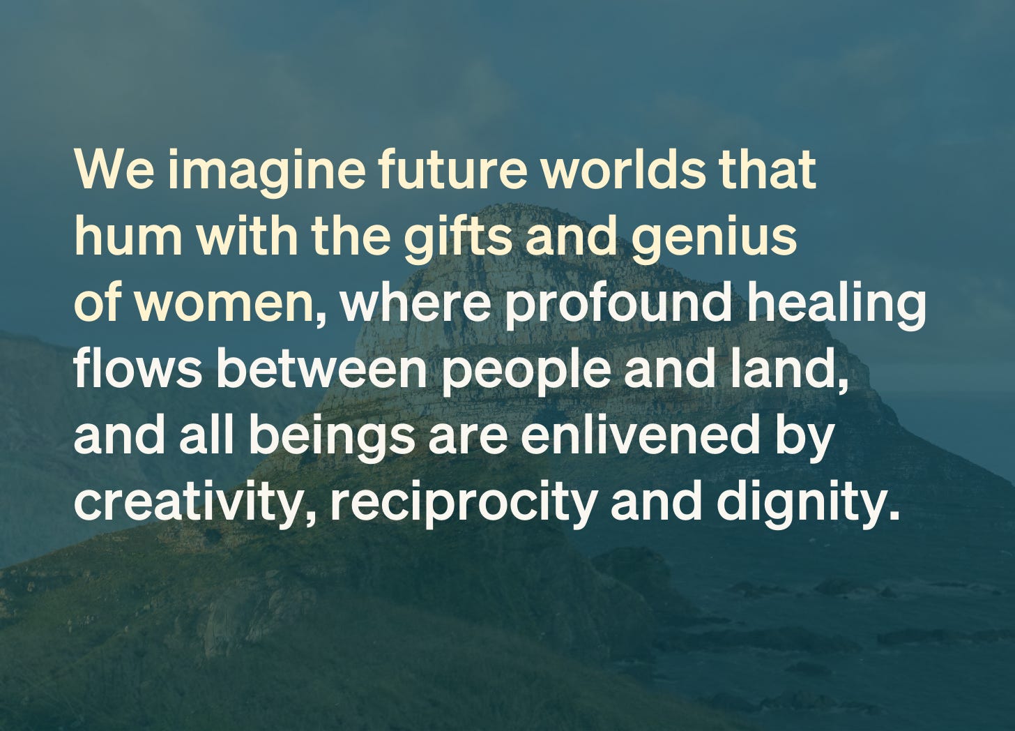 We imagine future worlds that hum with the gifts and genius of women, where profound healing flows between people and land, and all beings are enlivened by creativity, reciprocity and dignity.